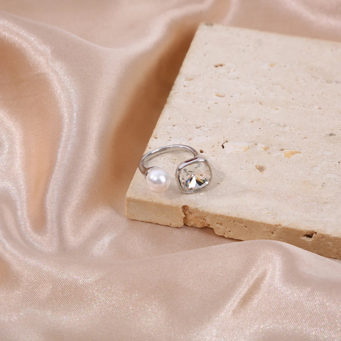 Bague dorée ouverte à l’avant strass carré angles arrondis et perle blanche ronde.